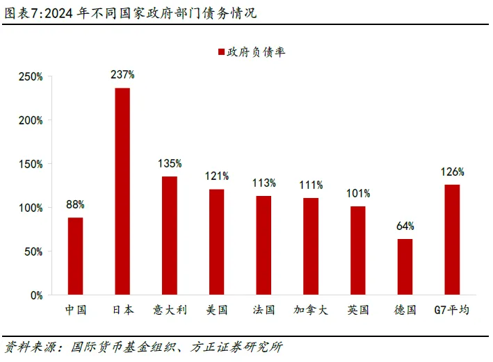 与全球主要国家相比,我国政府部门杠杆率并不高,财政政策仍然有空间。当前我国政府整体负债率显著低于主要经济体,整体债务水平处于可控范围之内。国际货币基金组织口径下,2024年我国政府负债率为88%。而G7国家平均政府负债率126%,具体来看,美国、法国、英国、意大利、加拿大政府部门杠杆率均超过了100%,日本政府部门杠杆率高达237%,仅德国政府部门杠杆64%略低于我国政府部门负债水平。