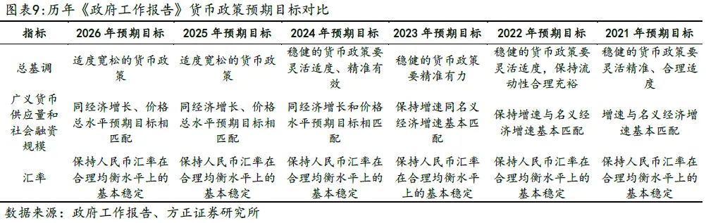 此外,本次《政府工作报告》继续保持“社会融资规模、货币供应量同经济增长和价格水平预期目标相匹配”的表述。过去几年由于价格指标的低迷导致名义经济增速低于实际经济增速,2025年全年实际GDP增长5.0%,而同期名义GDP增速仅为4%,经济名义增长不及实际增长。将匹配标准设定为经济增长和价格水平预期目标意味着目标中货币供应量以及社会融资规模的增速都将继续高于GDP增速。