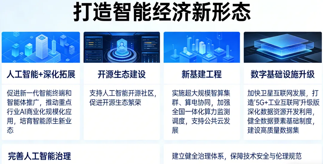 报告提出“打造智能经济新形态”,强调深化拓展“人工智能+”,推动智能终端、智能体等新产品加快落地,并促进人工智能在重点行业实现规模化商业应用。