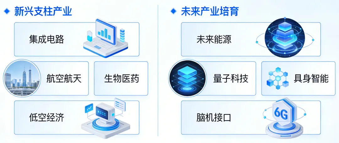 报告提出“打造集成电路、航空航天、生物医药、低空经济等新兴支柱产业”。这意味着上述产业正从成长型产业向国民经济支柱产业升级。