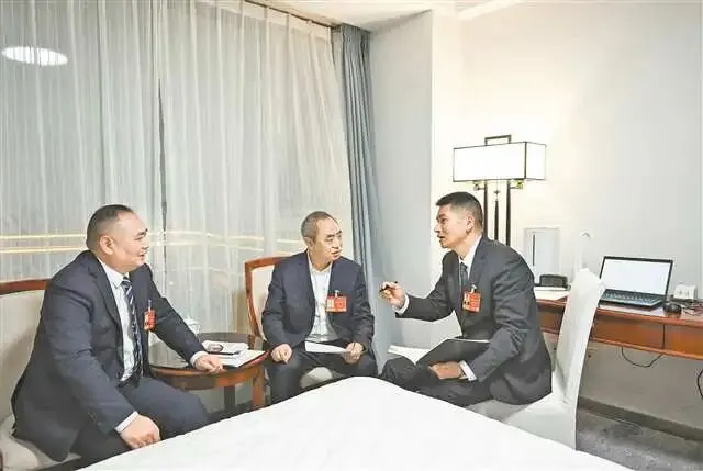 ▲3月3日晚上,重庆代表团住地,全国人大代表殷其龙、刘平、黄大勇(从右至左)围绕出租车行业现状与民众诉求,讨论如何推动出租车和网约车行业健康发展。记者 苏思 龙帆 摄/视觉重庆