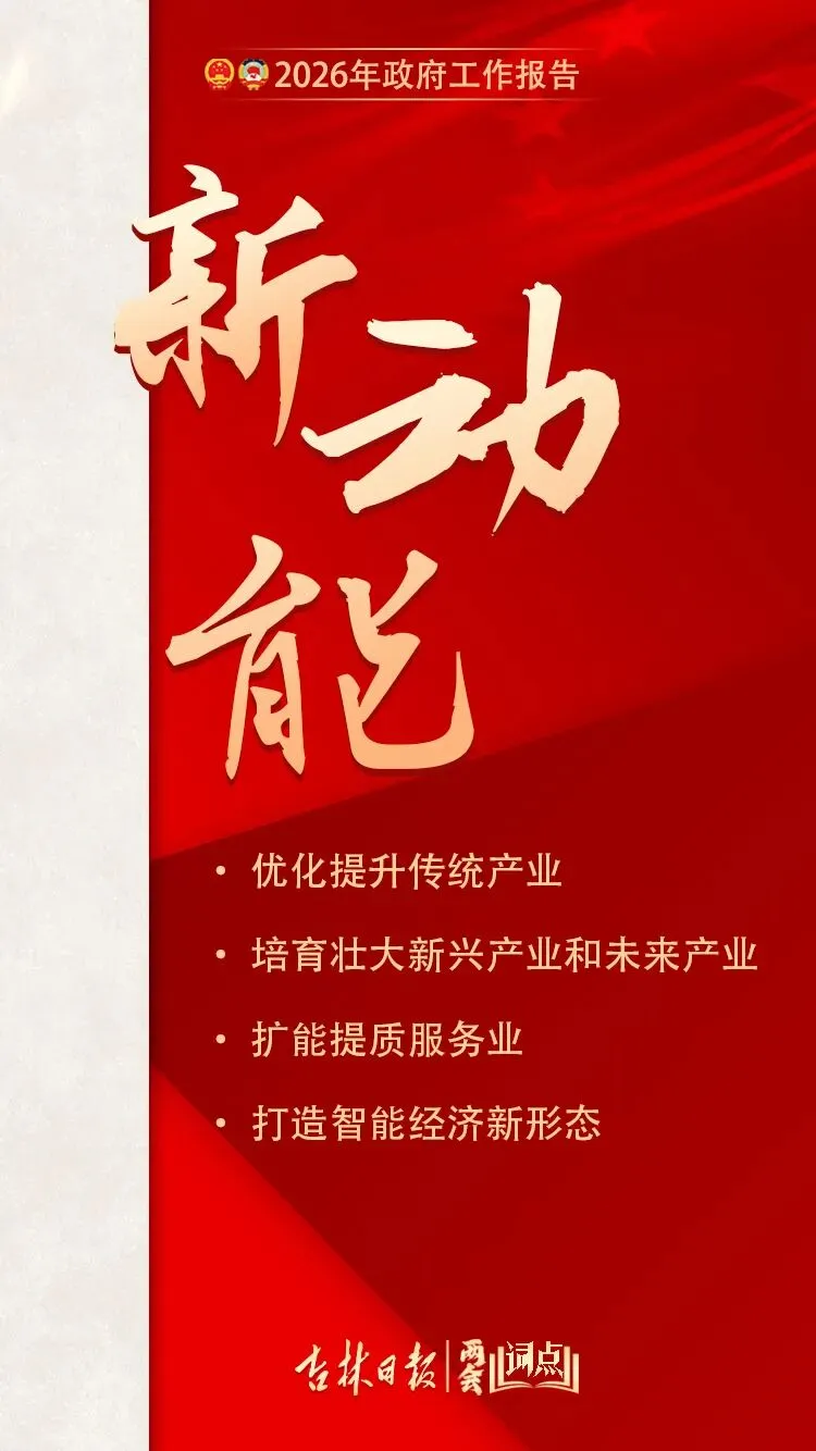 站在“十五五”开局的重要节点,全国两会隆重召开。全国两会不仅为中国式现代化擘画全局蓝图,更为新时代东北全面振兴提供行动遵循。2026年政府工作报告的一个个关键词,也是吉林精准对标的“施工图”和“任务书”。全省上下正在以一马当先的闯劲、快马加鞭的干劲、马不停蹄的韧劲,奋力推动高质量发展明显进位、全面振兴取得新突破!