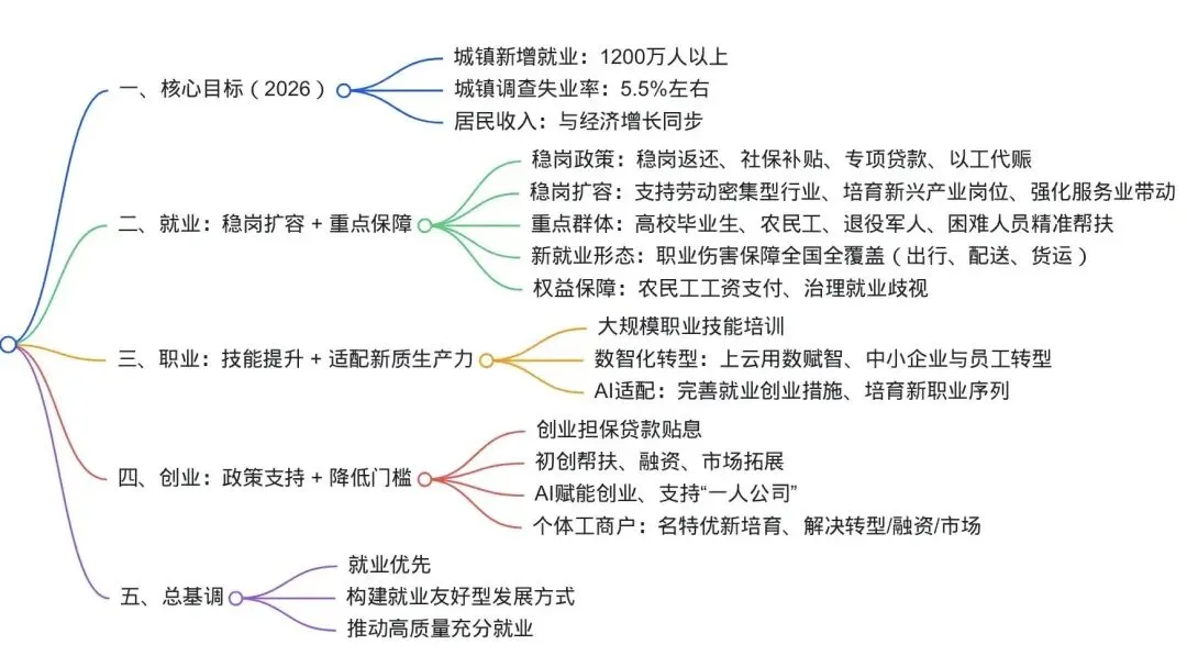 • 稳岗扩容提质行动:支持劳动密集型行业稳岗;围绕新兴/未来产业培育新职业新岗位;增强服务业就业带动