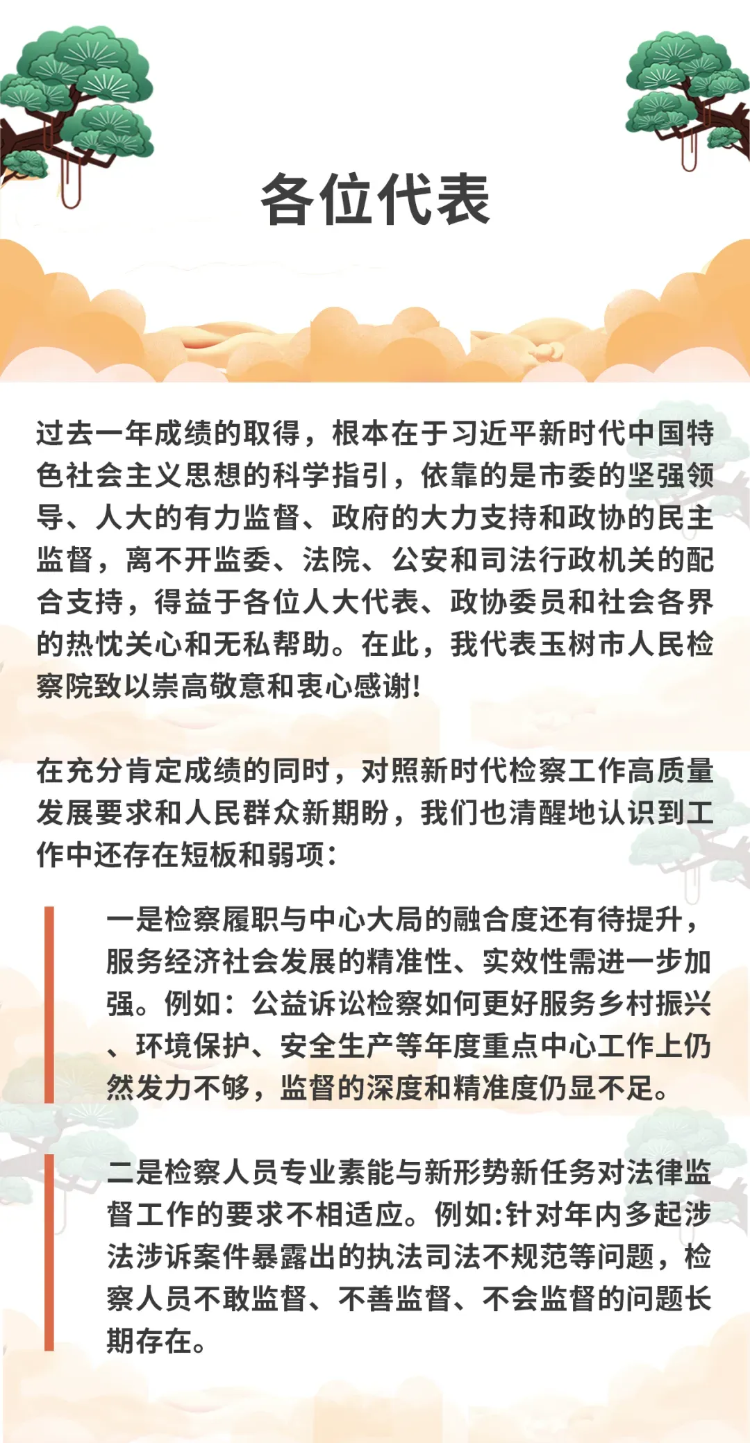现在,我代表玉树市人民检察院向大会报告工作,请予审议,并请各位人大代表、政协委员和列席会议的同志提出意见。