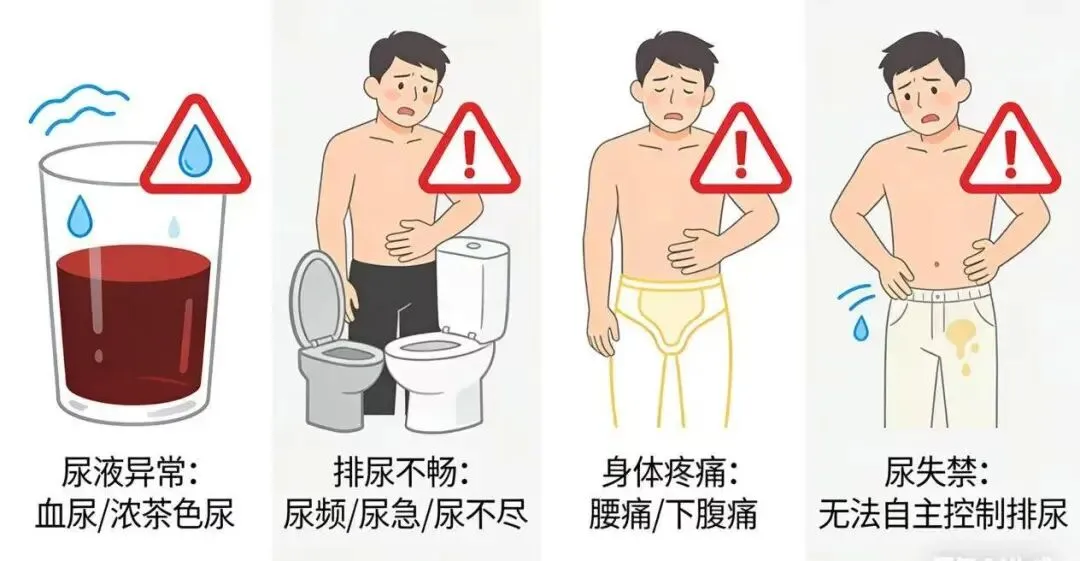 ▲管道不畅:尿频、尿急、尿痛、尿线细、排尿费力。