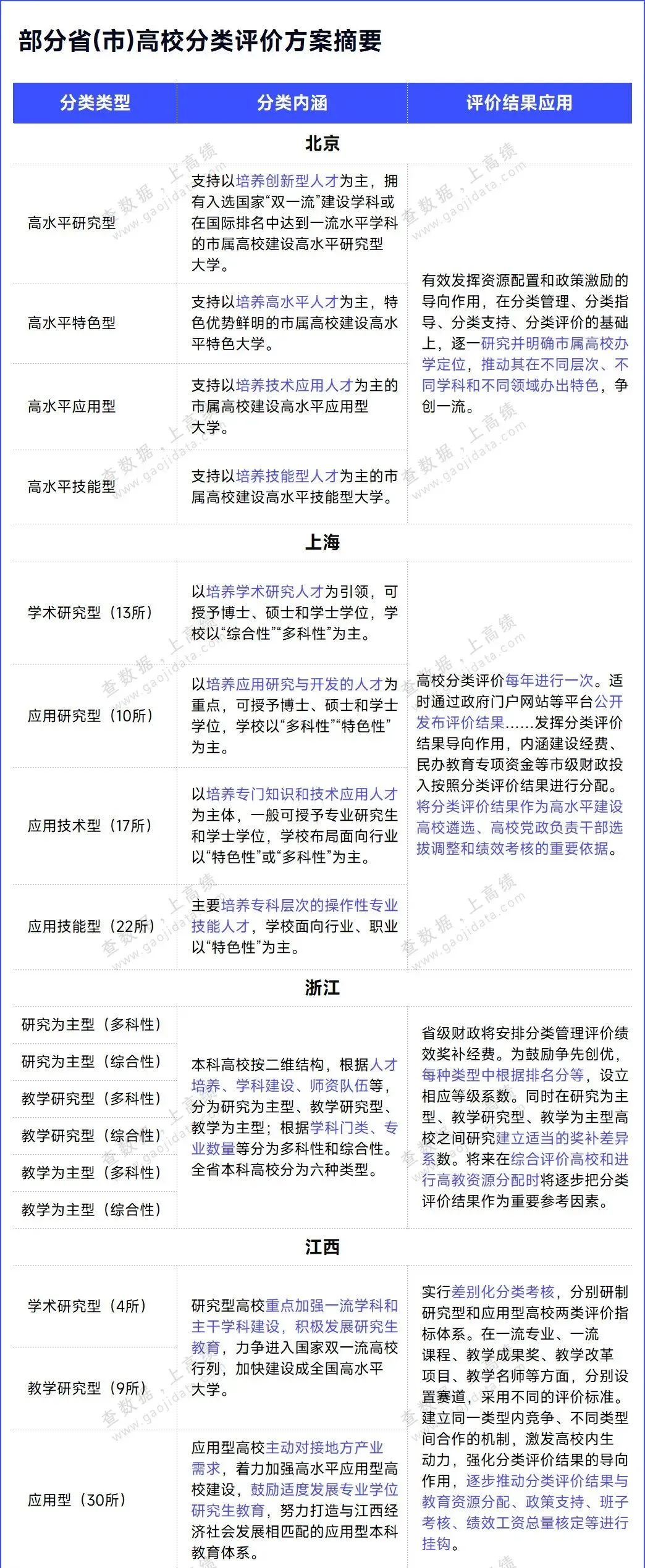 分类推进高校改革,关键在落地,而北京、上海、浙江等多个地区,已经先试先行,开展高校分类评价和管理,给全国其他地区提供了可借鉴的“参考答案”。早在2018年,北京就提出要推动高等学校分类发展,在分类管理、分类指导、分类支持、分类评价的基础上,逐一研究并明确市属高校的办学定位,推动这些高校在不同层次、不同学科领域办出特色、争创一流,坚决避免同质化竞争。比如有的市属高校重点对接北京的科技创新产业,有的重点对接文化产业,各自找准自己的优势领域,不再盲目攀比、跟风扩张。也是在2018年,上海印发了相关指导意见,通过出台分类评价指标、明确分类评价流程等全流程建设,系统构建了上海高校分类评价机制,让每所大学的发展都有明确的导向和标准。比如对研究型高校,重点评价科研成果、拔尖人才培养情况;对应用型高校,重点评价产教融合、服务地方产业的成效;对技能型高校,重点评价技能人才培养质量、学生就业率。除此之外,浙江、江西、山东等多个省份,也已经出台了相关方案,推进高校分类评价和发展,通过政策引导、资源倾斜,让不同类型的高校都能获得适合自身发展的支持,真正实现特色化、高质量发展。比如山东推行“一校一策”发展模式,引导高校立足区域产业需求凝练办学特色;广东依托粤港澳大湾区产业优势,推动高校与龙头企业共建现代产业学院,实现教育与产业深度融合。五、改革成效显著:这些高校,已经走出特色之路