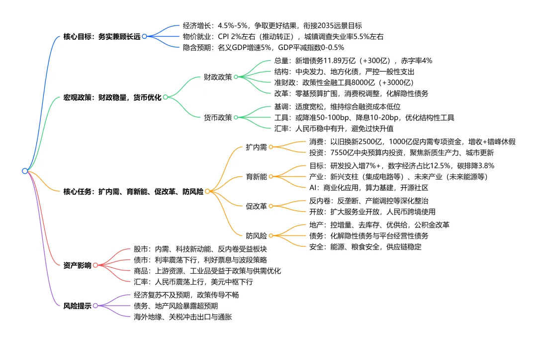 - 中央财政扛责:增量集中于中央赤字,地方新增债务规模持平,为地方化债留出空间,强调 “过紧日子”、严控一般性支出。