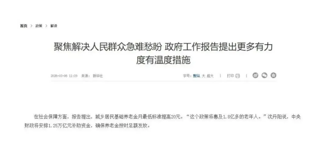 不倒翁翻了翻今年的报告,确实,城乡居民养老金写得明明白白:"再提高20元"。可往年那句"退休人员基本养老金上涨",今年愣是没出现。
