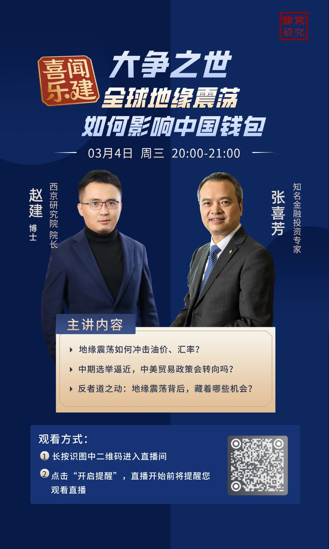 2026年3月7日,西京研究院赵建院长与资深金融专家张喜芳先生再度聚首,展开《喜闻乐建》第四期视频对谈,本期主题聚焦正在召开的全国两会与刚刚出炉的政府工作报告。在“十五五”开局之年,报告罕见的以“稳、定、实”三个关键字定调,似乎平淡无奇,却隐含着从外生刺激向内生动能切换的重大转折信号。两位嘉宾围绕政策力度、房地产新定位、自主可控投资主线以及个人层面的“向内求”,展开了深度对话。以下为对谈实录精编版,希望能为您的决策提供些许参考。《喜闻乐建》栏目将定期与大家见面,欢迎持续关注。