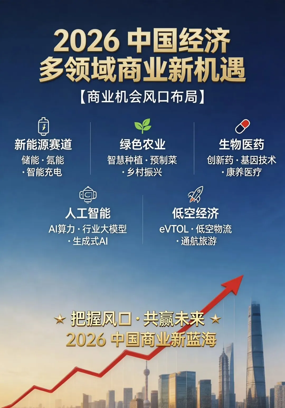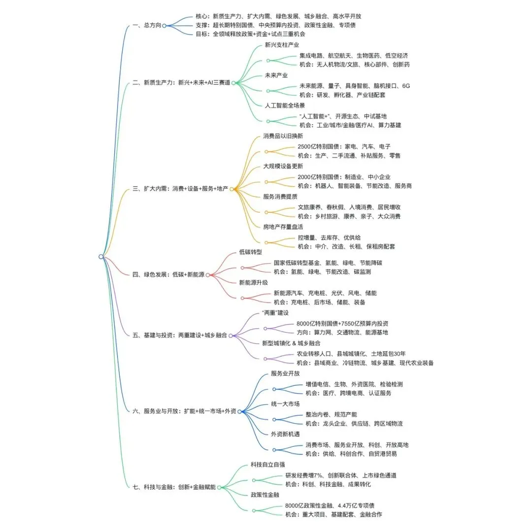 2026年政府工作报告围绕新质生产力培育、扩大内需、绿色发展、城乡融合、高水平开放等核心方向布局,释放出多领域商业机会,覆盖新兴产业、消费升级、基建投资、服务业开放等板块,政策配套资金与试点支持明确,以下是核心机会梳理: