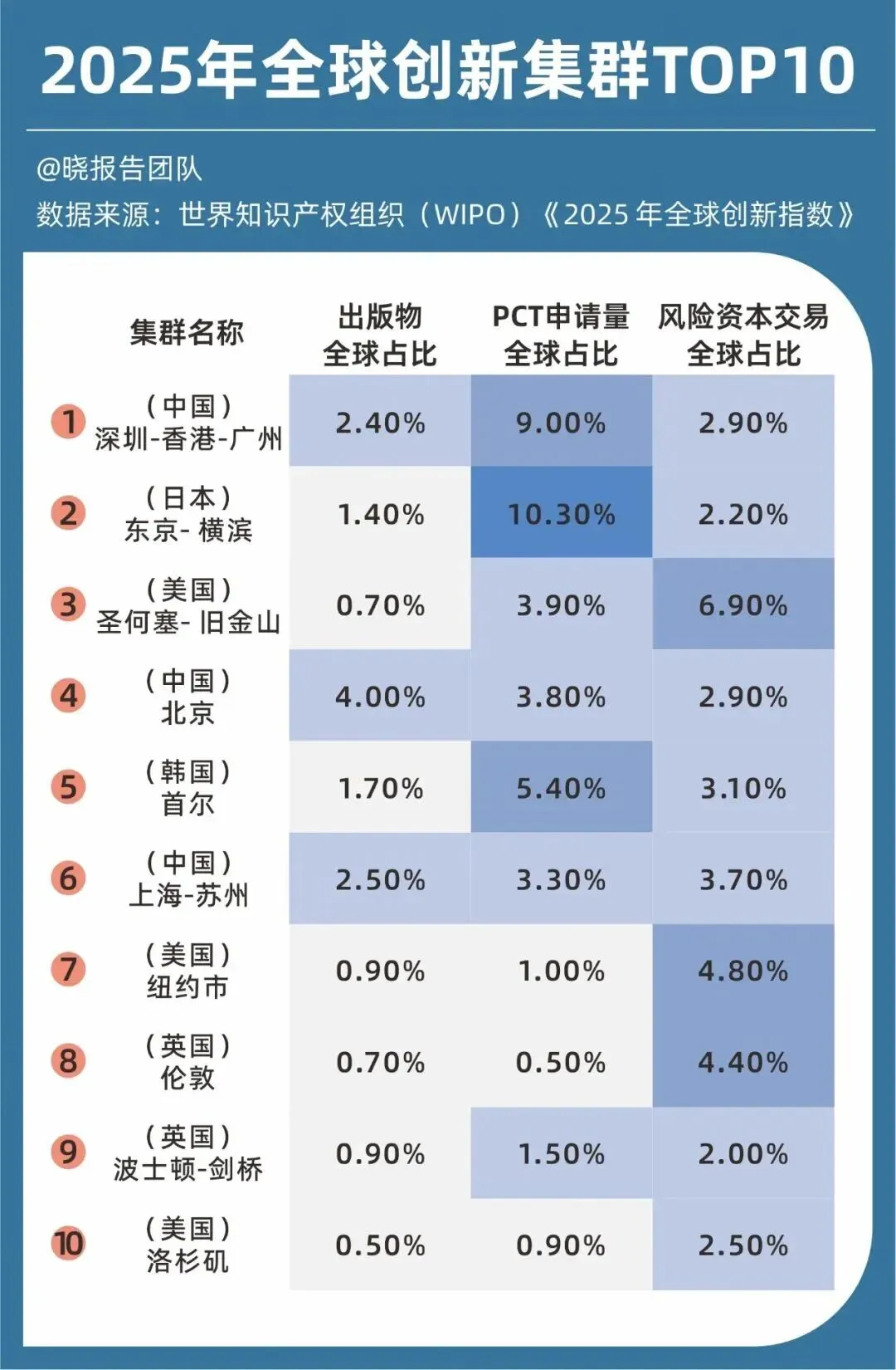 自从世界知识产权组织(WIPO)发布《2025年全球创新指数报告》,公布全球排名前十的科技创新集群中,中国占据三席,其中深圳-香港-广州城市群排名世界第一,北京排名第四,上海-苏州城市群排名第六。且中国创新指数排名提升至全球第十位,首次跻身全球前十以来,标志着中国在全球创新版图中的角色发生了根本性转变,从过去的“追赶者”正式成为第一梯队的“并跑者”。