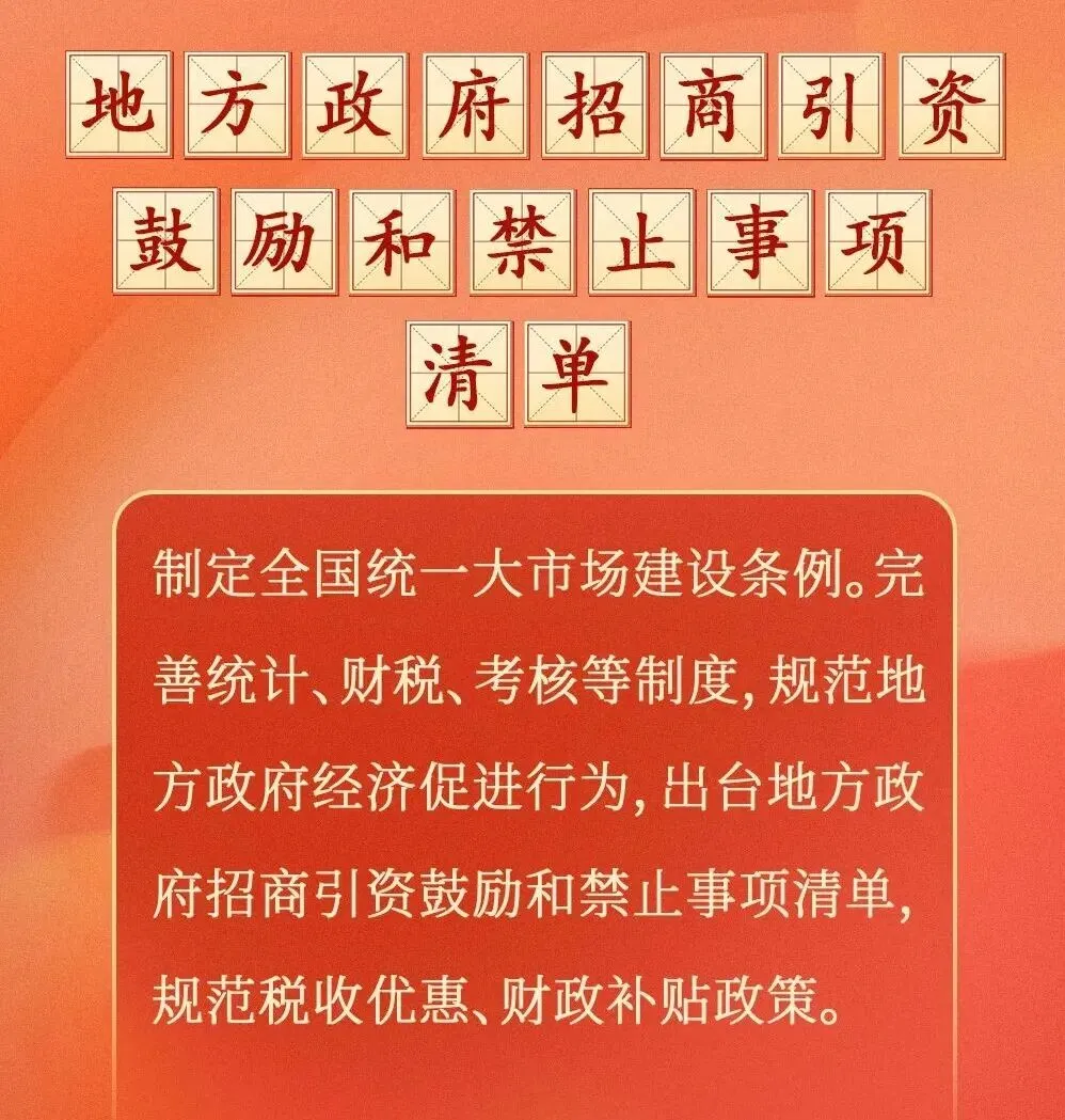 今年政府工作报告在“推进全国统一大市场建设”中就使用了全新表述“制定全国统一大市场建设条例,完善统计、财税、考核等制度,规范地方政府经济促进行为,出台地方政府招商引资鼓励和禁止事项清单,规范税收优惠、财政补贴政策”。简称“一条例二清单三制度”。