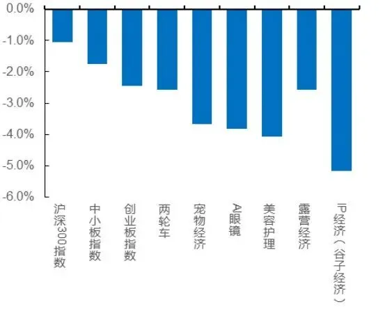 本周沪深300指数涨跌幅-1.1%。本周家电板块涨跌幅-2.9%,其中白电/黑电/小家电/厨电板块涨跌幅分别-2.2%/-2.9%/-3.1%/-2.7%。本周纺织服装板块涨跌幅-2.8%。本周新消费相关板块中,两轮车涨跌幅-2.6%,宠物经济涨跌幅-3.7%,AI眼镜涨跌幅-3.8%,美容护理涨跌幅-4.1%,露营经济涨跌幅-2.6%,IP经济(谷子经济)涨跌幅-5.2%。