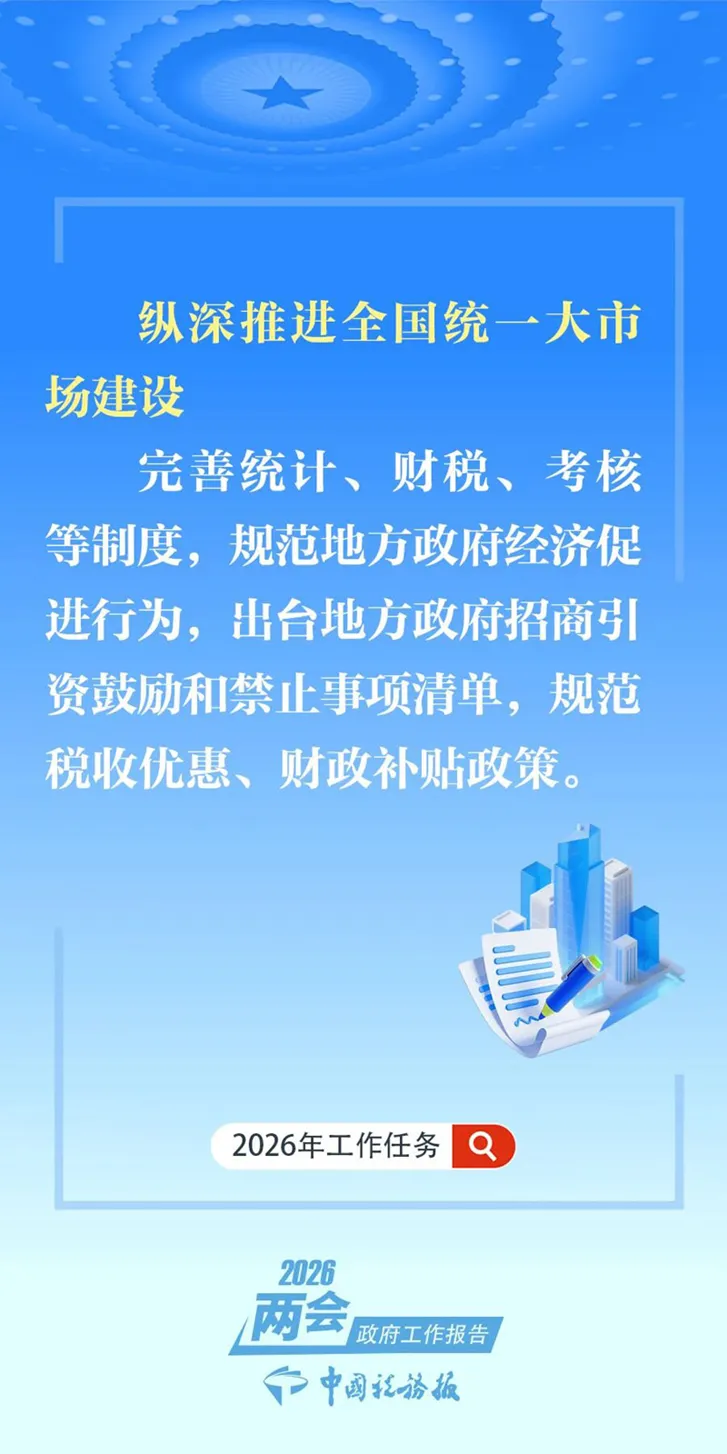 纵深推进全国统一大市场建设。制定全国统一大市场建设条例。完善统计、财税、考核等制度,规范地方政府经济促进行为,出台地方政府招商引资鼓励和禁止事项清单,规范税收优惠、财政补贴政策。深化招标投标体制机制改革。加强反垄断、反不正当竞争,强化公平竞争审查刚性约束,综合运用产能调控、标准引领、价格执法、质量监管等手段,深入整治“内卷式”竞争,营造良好市场生态。深化要素市场化配置综合改革试点,将更多符合条件的地区纳入试点范围。稳步推进公用事业和公共服务价格改革。
