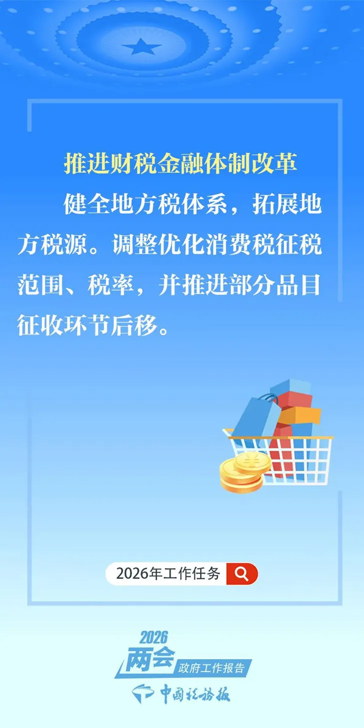 推进财税金融体制改革。加大财政资源和预算统筹力度,提高国有资本收益收取比例。加强财政科学管理,深化零基预算改革,进一步扩大中央部门试点范围。健全地方税体系,拓展地方税源。调整优化消费税征税范围、税率,并推进部分品目征收环节后移。规范金融机构竞争秩序,深入推进地方中小金融机构减量提质。持续深化资本市场投融资综合改革,进一步健全中长期资金入市机制,完善投资者保护制度,拓展私募股权和创投基金退出渠道,提高直接融资、股权融资比重。