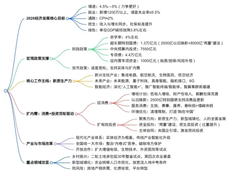 核心锚定:稳中求进、提质增效,以新质生产力为核心,依托超长期特别国债、专项债、政策性金融工具,聚焦两重工程、十五五开局项目,推动投资止跌回稳、民间资本激活 。