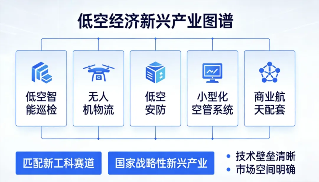 作为国家战略性新兴产业与高教主赛道新工科类别的重点匹配方向,低空经济具备清晰技术壁垒与广阔市场空间,核心赛道涵盖多个方面。