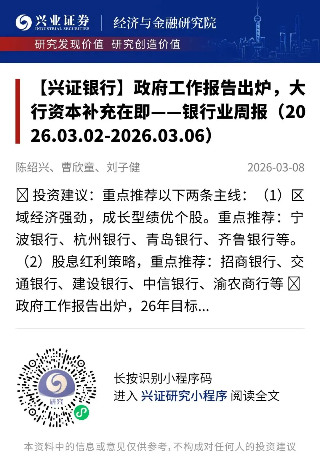 证券研究报告:《政府工作报告出炉,大行资本补充在即——银行业周报(2026.03.02-2026.03.06)》