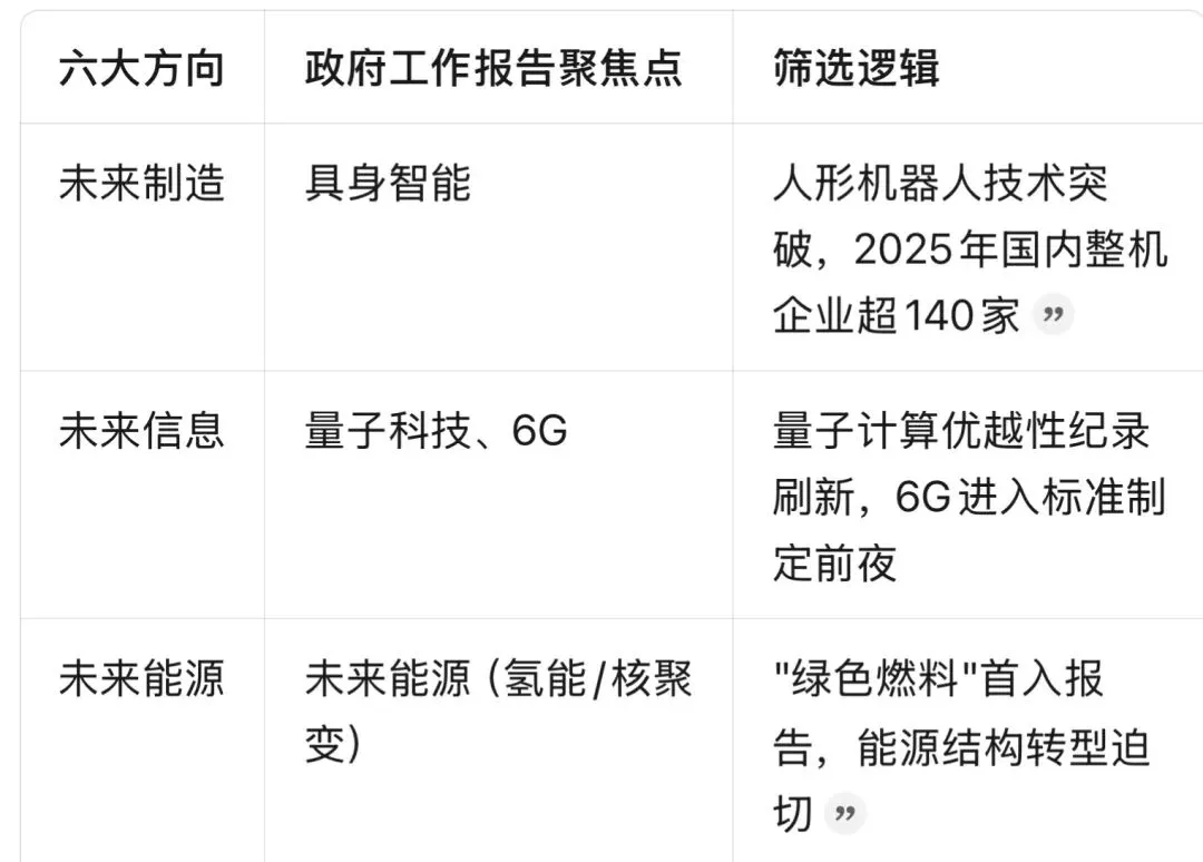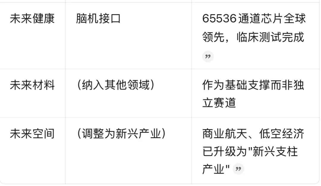 • 未来产业(5个):未来能源、量子科技、具身智能、脑机接口、6G等