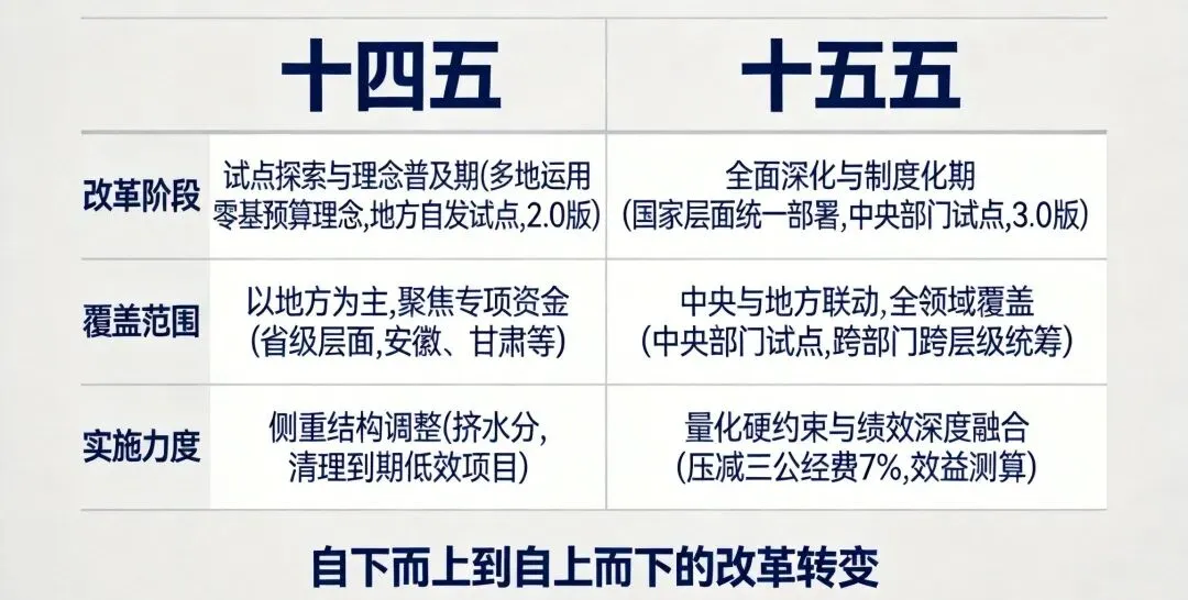 简单来说,“十四五”时期零基预算主要是为改革“破题”,而2026年及以后的“十五五”时期,则是要将改革“做实”,通过更广的范围和更硬的手段,真正实现财政资金的提质增效。