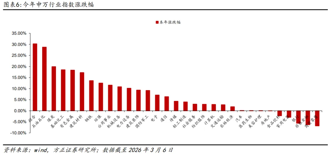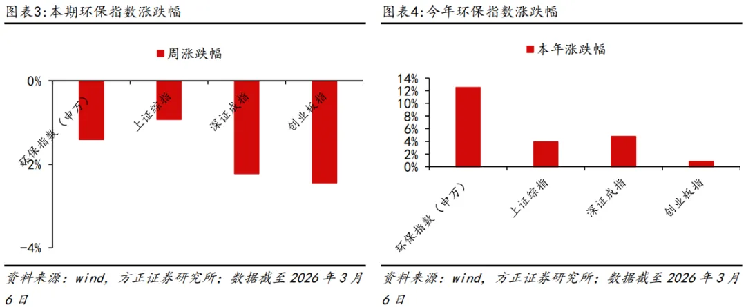 本周(截至2026年3月6日)环保指数(申万)下跌1.41%,相较上证综指跑输0.48pct,但分别跑赢深证成指0.82pct、创业板指1.04pct。年初至今环保指数上涨12.51%,分别跑赢上证综指8.60pct、深证成指7.73pct、创业板指11.70pct。