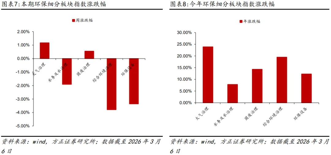 本周环保子板块普遍回调,其中大气治理、水务及水治理、固废治理、综合环境治理、环保设备涨跌幅分别为1.17%、-1.91%、0.55%、-3.79%、-3.35%。截至2026年3月6日,年初至今大气治理、水务及水治理、固废治理、综合环境治理、环保设备板块涨跌幅分别为23.88%、7.83%、14.32%、19.50%、12.31%。