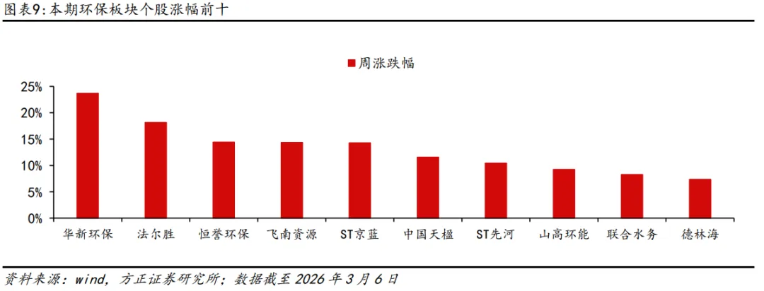 本周环保行业涨幅居前的公司为华新环保(+23.67%)、法尔胜(+18.15%)、恒誉环保(+14.39%)、飞南资源(+14.36%)、ST京蓝(+14.29%)、中国天楹(+11.55%)、ST先河(+10.43%)、山高环能(+9.24%)、联合水务(+8.25%)、德林海(+7.33%)。
