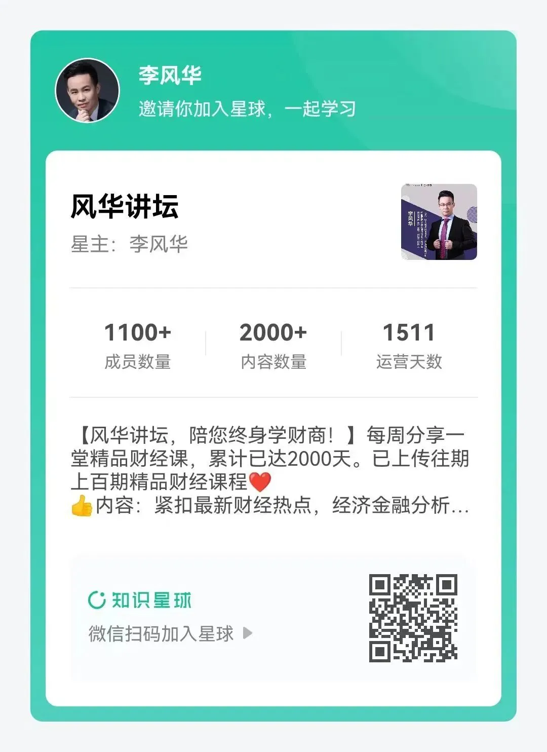 “风华讲坛”财经微课创立于2015年,每周一堂精品财经课,6年来已累计授课200多期,培训学员上100万人次,内容涵盖:国际金融、中国经济、政治博弈、金融市场、人民币汇率、楼市、股市、商业模式、家庭理财、另类投资等各个方面。