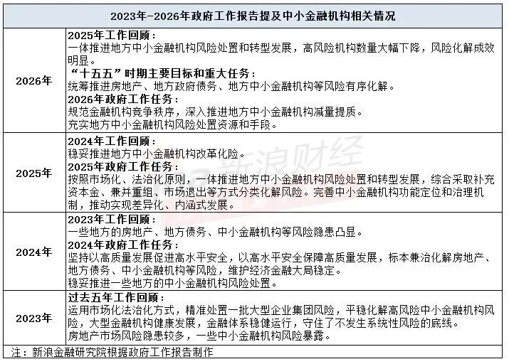 在总结2025年相关工作时,2026年政府工作报告则指出,2025年一体推进地方中小金融机构风险处置和转型发展,高风险机构数量大幅下降,风险化解成效明显。
