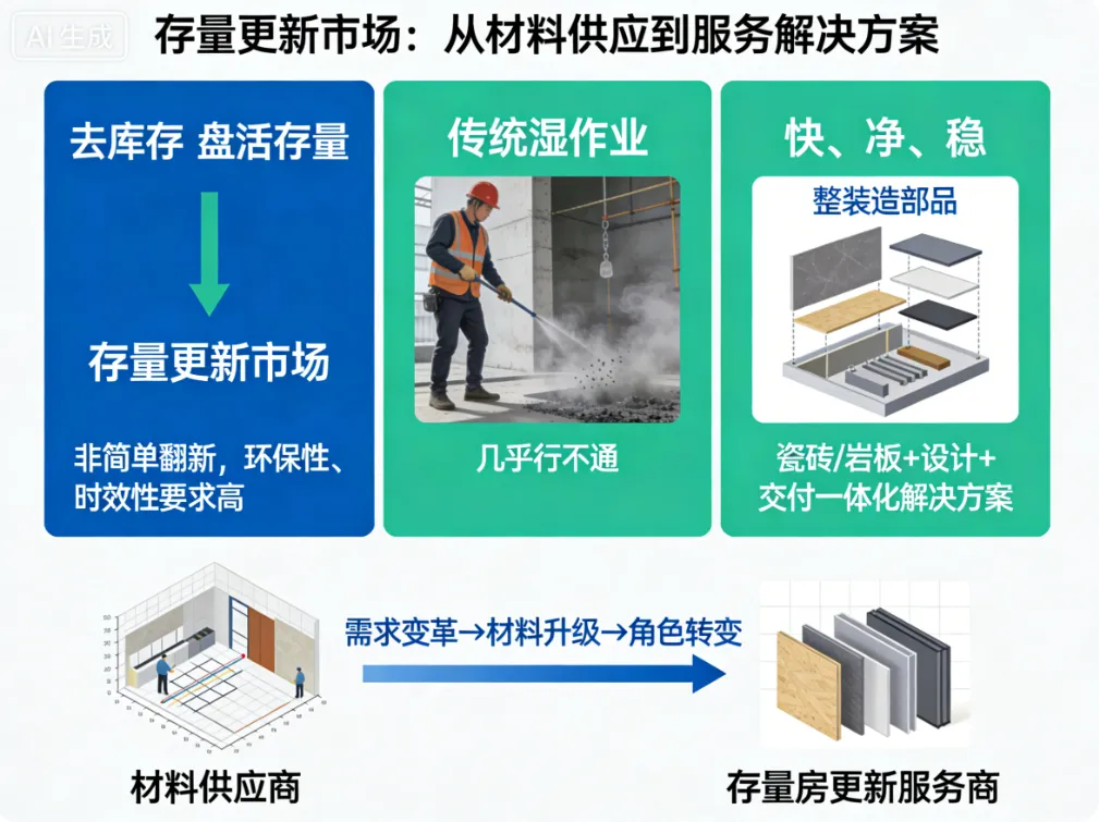“去库存”和“盘活存量”,催生了一个巨大的“存量更新”市场。这不是简单的翻新,存量更新对施工的环保性、时效性要求极高。传统“湿作业”几乎行不通。