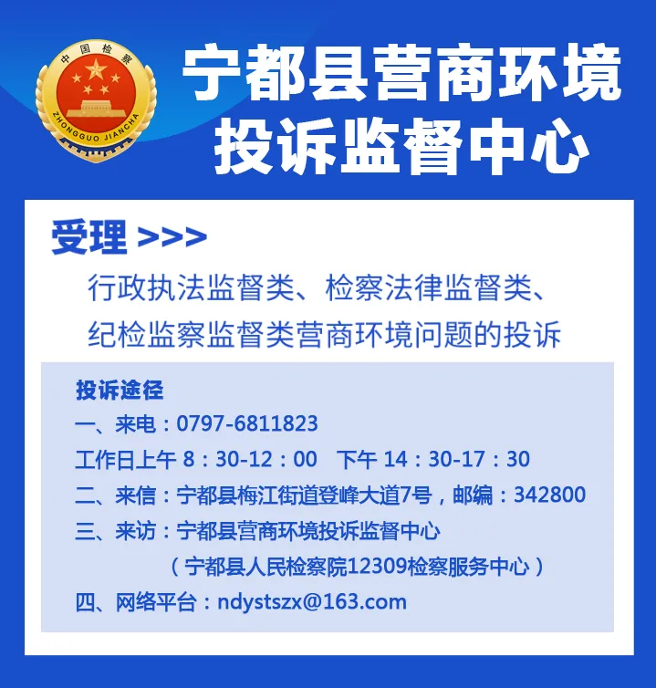 宁都县人民检察院始终坚持以人民为中心,把群众满意作为衡量工作成效的最高标准。如果您对检察机关在作风、效率、服务、廉洁方面有任何意见建议,请拨打宁都县人民检察院服务热线:6912309。期待您的持续关注和支持,我们将不断改进,用心为您提供优质的检察服务。