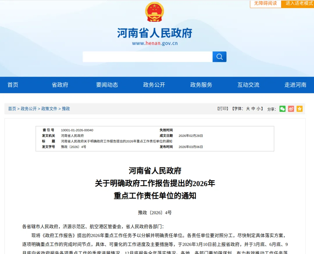 2月28日,河南省人民政府发布《河南省人民政府关于明确政府工作报告提出的2026年重点工作责任单位的通知》,就《政府工作报告》提出的2026年重点工作任务予以分解并明确责任单位。