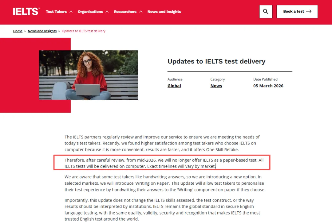 近日,雅思在官网发文宣布:预计从2026年中旬开始,雅思考试将全面转为机考模式。
