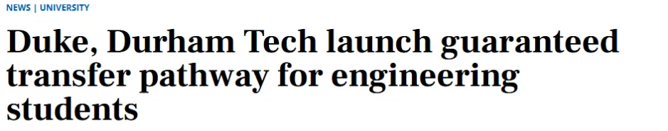 近日,杜克大学近期官宣将与达勒姆技术社区学院(Durham Tech)正是签署了转学保证协议,成为全美首个与社区大学签订此类协议的 USNews Top10 高校,打破了顶尖私立名校转学无保障的现状。学校将于2026年秋季招收首批学生,首批录取人数不超过25人。