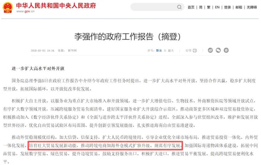 政策护航+合规前行!跨境电商+海外仓迎来发展新机遇!2026年的政府工作报告明确部署,要培育壮大贸易发展新动能,推动跨境电商与海外仓融合模式扩容升级、规范有序发展。该部署为跨境电商行业明确了发展方向,既是国家政策红利的集中释放,也对行业合规经营提出了更高标准,助力跨境电商在高水平对外开放格局中实现高质量发展。