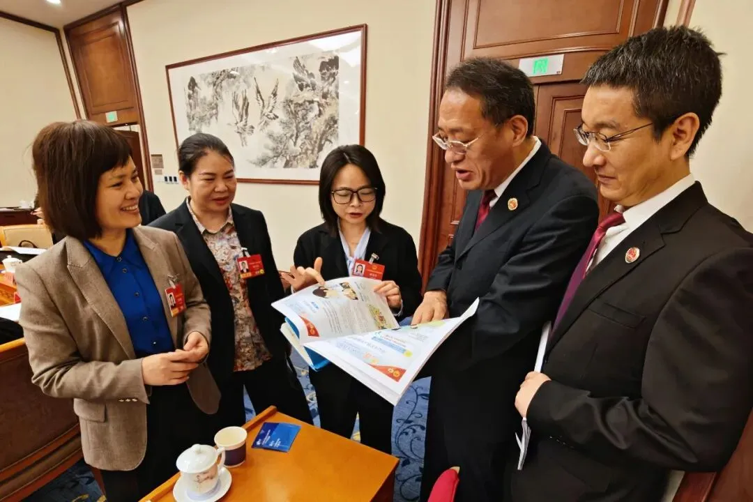 3月10日上午,广西代表团举行小组会议审议最高人民法院工作报告、最高人民检察院工作报告。会议结束后,全国人大代表覃宝华(左三)、全国人大代表廖玉英(左二)、全国人大代表李燕锋(左一)高度评价了《悦读·最高检工作报告》,并建议以《悦读·最高检工作报告》的形式开发更多未成年人普法读物。