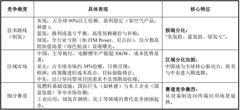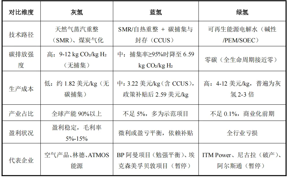 - “灰氢稳、蓝氢弱、绿氢亏”:灰氢凭借成熟技术与成本优势(约1.82美元/kg)占据全球90%以上份额,是行业唯一稳定现金流来源;蓝氢因CCUS推高成本30%-50%,陷入“减碳不经济”的尴尬境地,仅少数项目微利;绿氢虽为零碳终极方向,但生产成本高达4-12美元/kg(灰氢2-3倍),全行业普遍亏损。