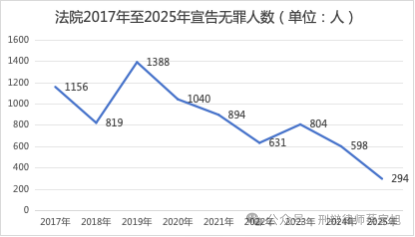 由上图可以看出,法院宣告无罪的人数在2019年达到峰值后一路下降,仅2023年出现小幅度回升,下降趋势极其明显。
