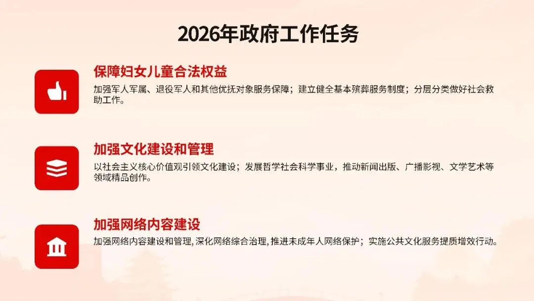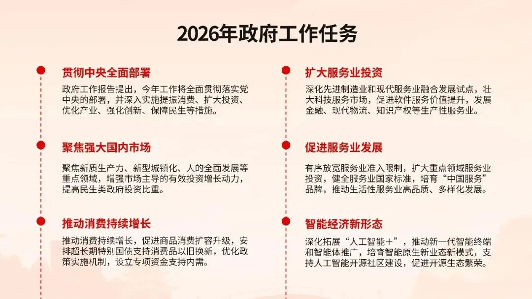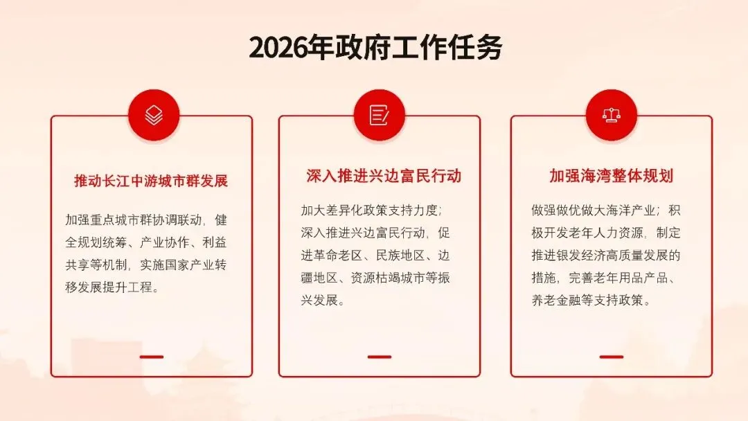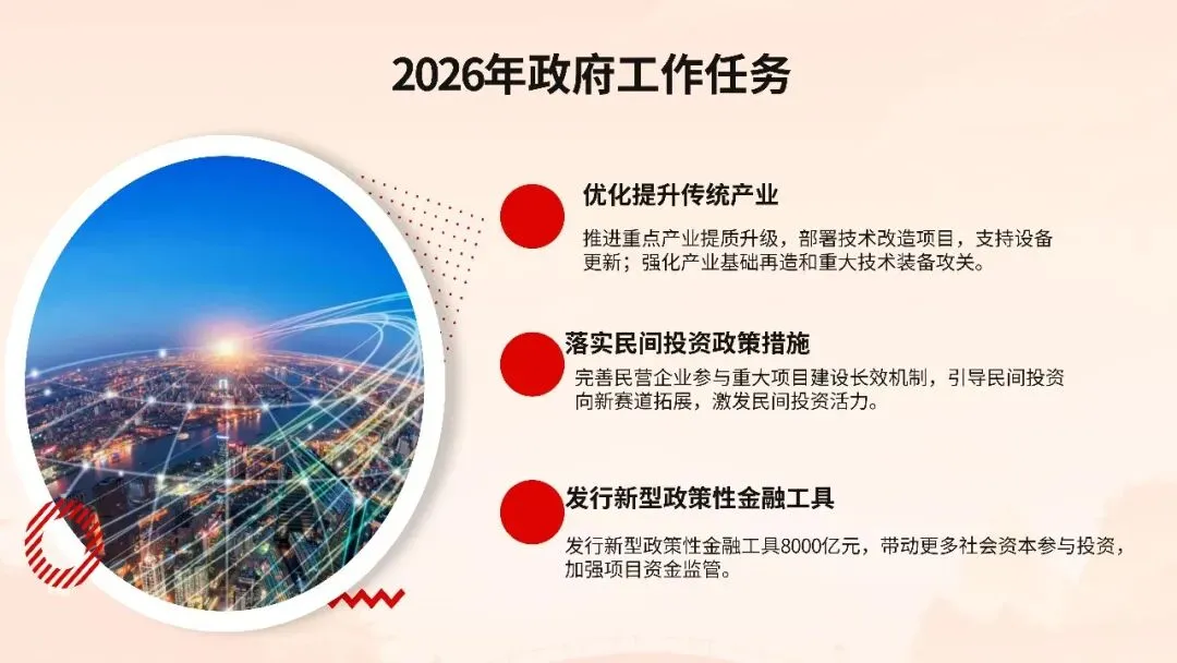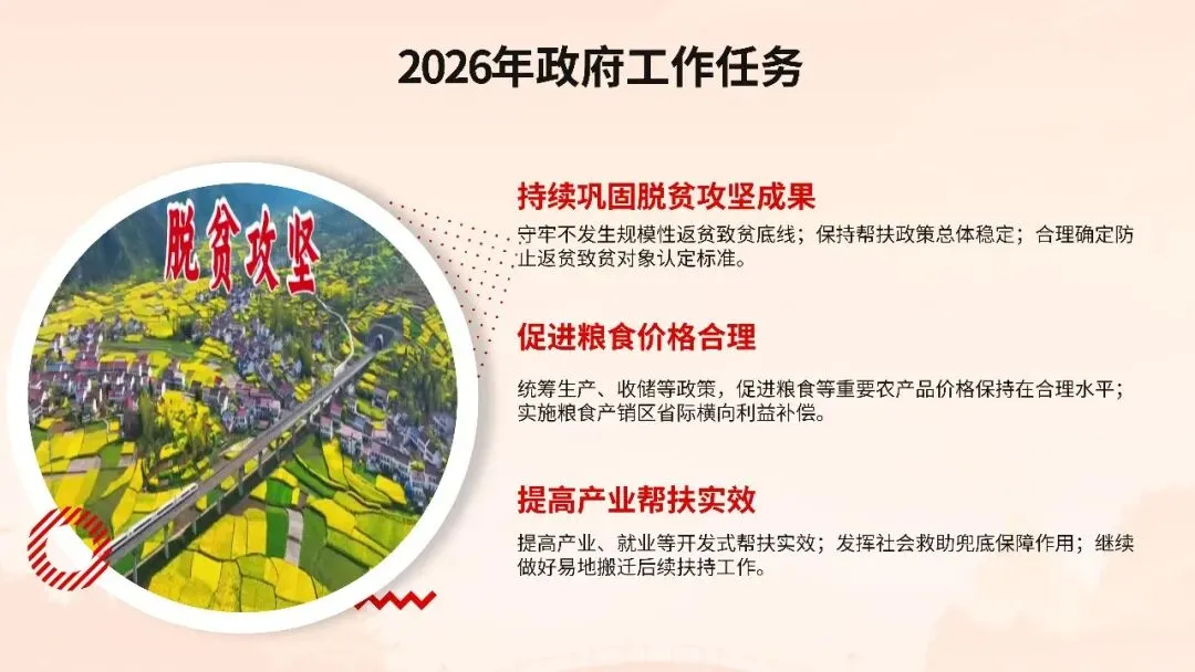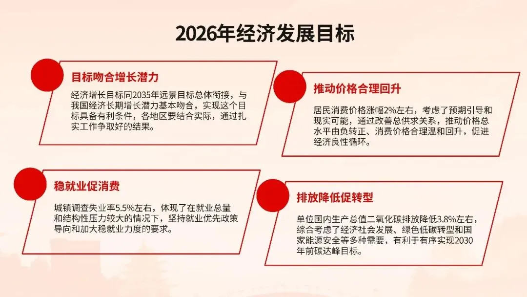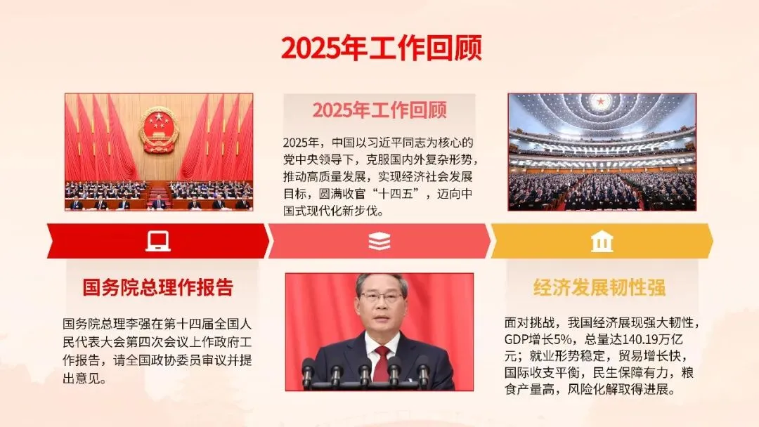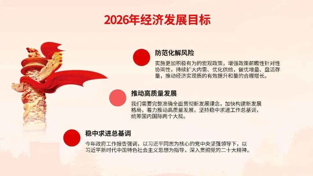 2026年全国两会政府工作报告在万众瞩目中隆重发布,这份承载着人民期待、彰显时代使命的纲领性文件,为“十四五”规划收官之年锚定了发展航向。报告以“稳中求进、以进促稳”为总基调,明确提出全年经济增长预期目标,强调在复杂国际形势下巩固回升向好态势,推动经济实现质的有效提升和量的合理增长。