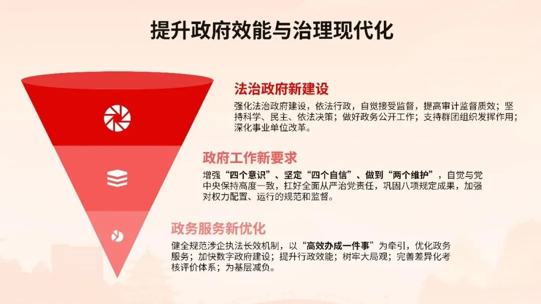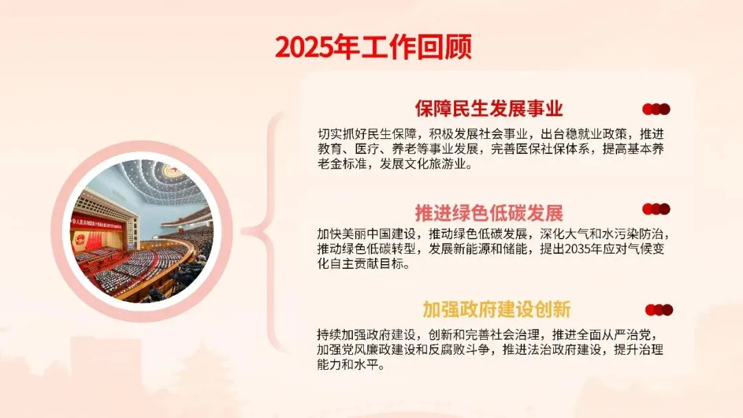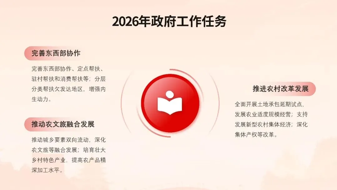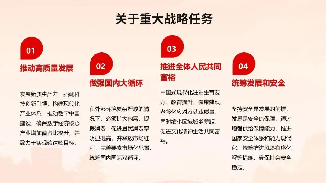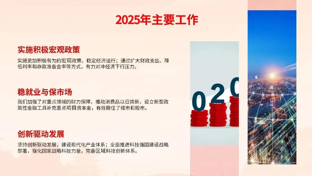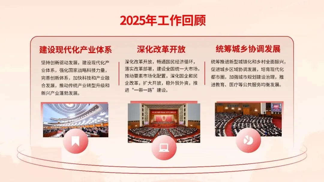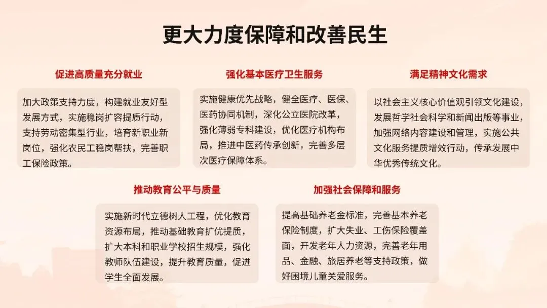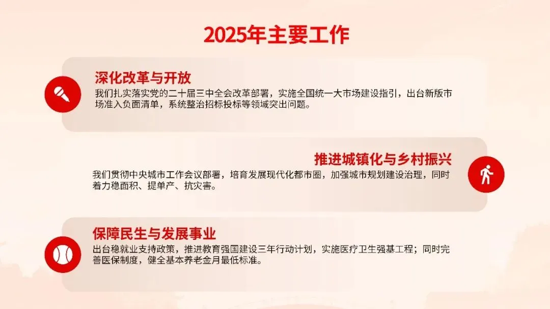 报告聚焦高质量发展首要任务,部署科技创新引领产业升级、数字经济与实体经济深度融合、绿色低碳转型等战略举措,同时突出民生保障“温度”,在就业优先、教育均衡、医疗普惠、养老服务等领域推出系列实招硬招。这份报告既是政府向人民交出的“承诺书”,更是全国上下共谋发展的“施工图”。宣讲其精髓要义,需以数据为基、以案例为翼,让政策红利可感可及,凝聚起奋进新征程的磅礴力量。