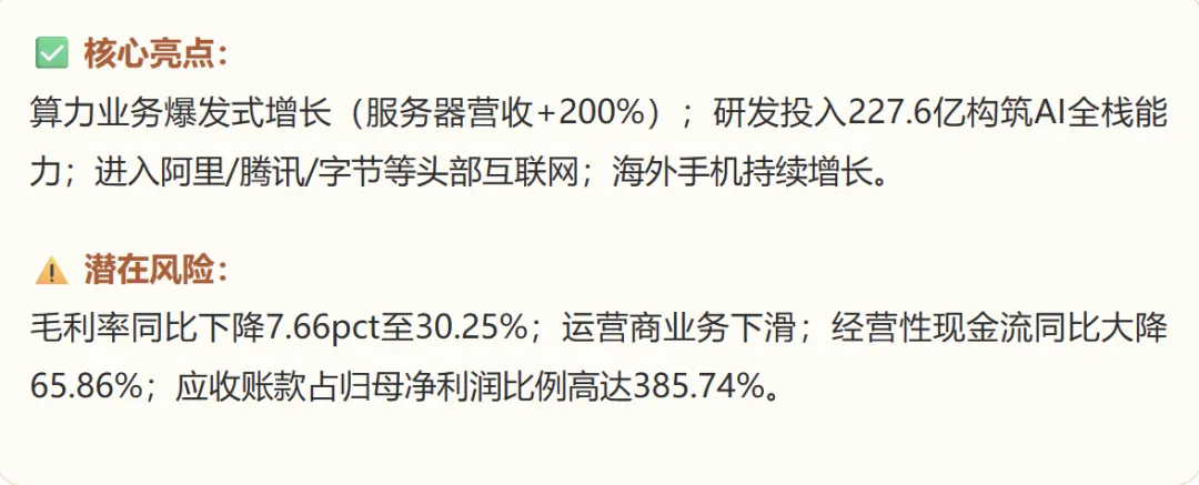 最亮眼的是算力业务,全年营收同比增长约150%,占总营收比重达24.6%。其中服务器及存储营收同比增长超200%,数据中心产品营收同比增长50%。研发投入方面,2025年公司研发费用达227.6亿元,占营收比例约17.0%。