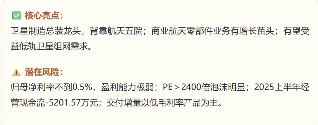 商业航天市场竞争激烈,低轨星座组网是核心预期,但产业培育周期长。股价2025年12月-2026年1月累计上涨超190%,市值大增,但业绩仍处低谷,公司自身也提示传统订单减少、竞争激烈等风险。