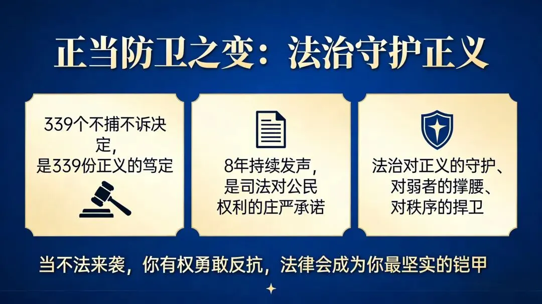 339个不捕不诉的决定,是339份正义的笃定;8年持续发声,是司法对公民权利的庄严承诺。最高检工作报告中正当防卫的“之变”,本质是法治对正义的守护、对弱者的撑腰、对秩序的捍卫。当不法来袭,你有权勇敢反抗,法律会成为你最坚实的铠甲。