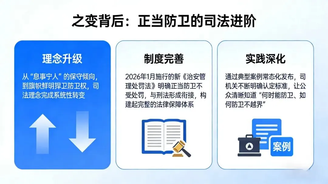 • 制度完善:2026年1月施行的新《治安管理处罚法》明确正当防卫不受处罚,与刑法形成衔接,构建起完整的法律保障体系。