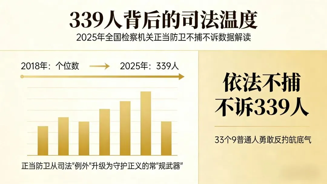 2025年,全国检察机关对审查认定属正当防卫的涉案人员,依法不捕不诉339人。这个数字背后,是339个普通人勇敢反抗不法侵害的底气,是司法机关对“谁死伤谁有理”错误认知的坚决纠偏。从2018年个位数到如今高位运行,正当防卫已从司法“例外”升级为守护正义的“常规武器”。