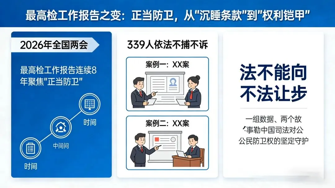 2026年全国两会,最高检工作报告再次将“正当防卫”置于聚光灯下——这是该话题连续8年被写入报告。339人依法不捕不诉、两起典型案例清晰释法,一组数据、两个故事,共同勾勒出中国司法对公民防卫权的坚定守护,让“法不能向不法让步”从理念变为可触摸的正义。