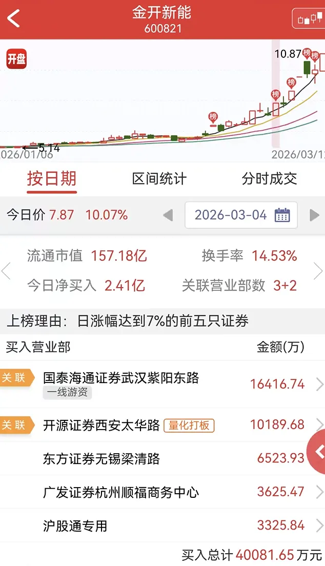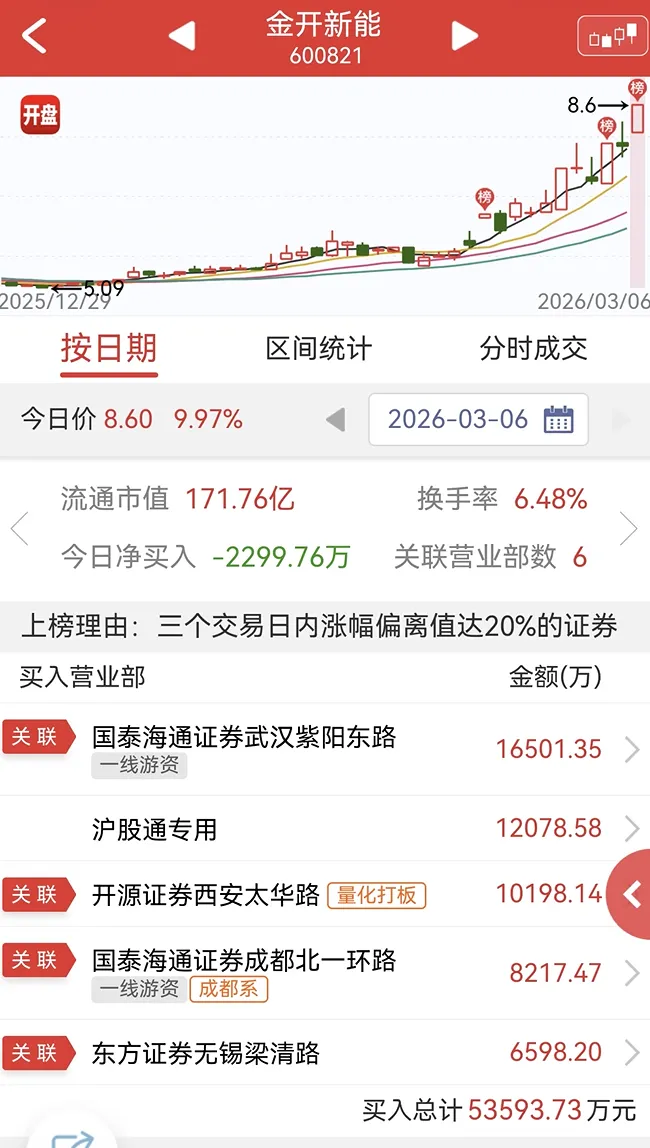 金开新能3月6日三日榜,金开新能:国泰海通证券武汉紫阳东路买入16501万,成都系买入8217万,东方证券无锡梁清路买入6598万金开新能:国泰海通证券武汉紫阳东路买入16501万,成都系买入8217万,东方证券无锡梁清路买入6598万