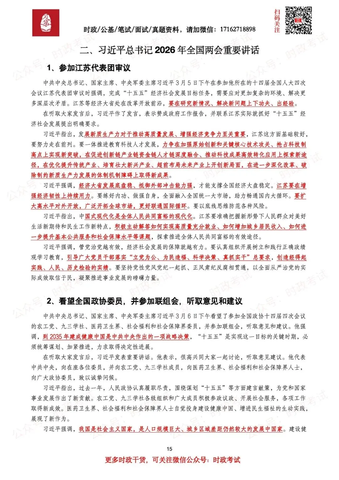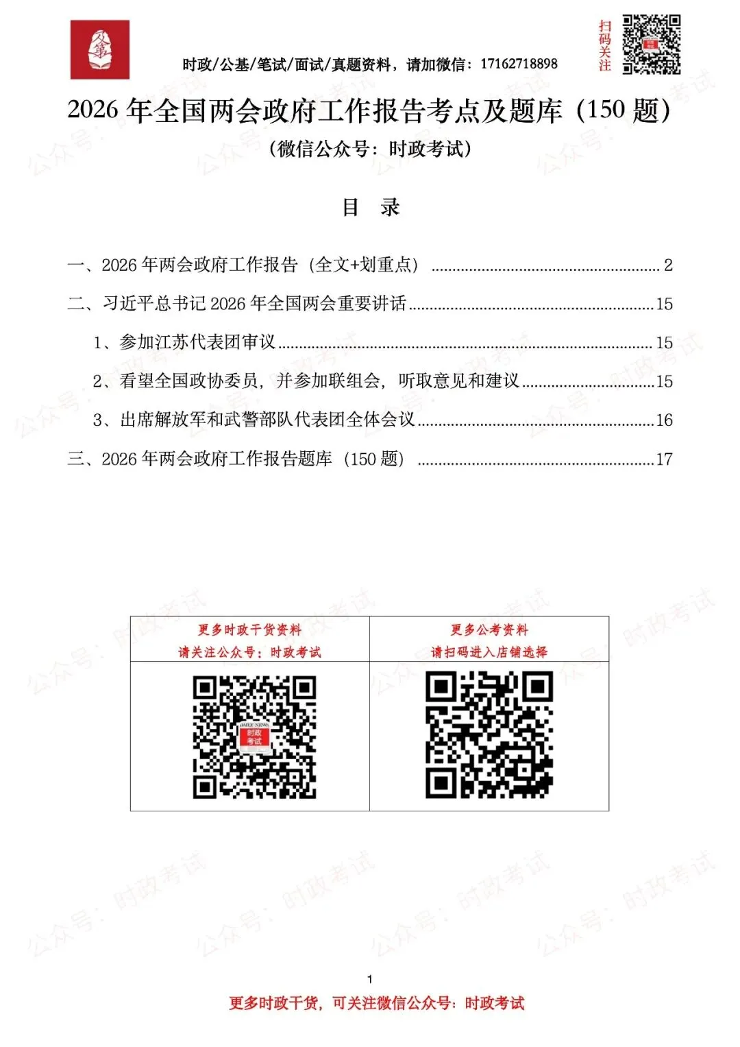 每年的全国两会政府工作报告都是各个考试重要考点,参加各个考试的考生都必须要掌握。2026年全国两会政府工作报告考点及试题已经整理好了,包含2026年全国两会政府工作报告(全文+划重点),习近平总书记2026年全国两会重要讲话(考点+划重点),2026年两会政府工作报告题库(150题)等,共计36页。后附目录及部分内容截图。