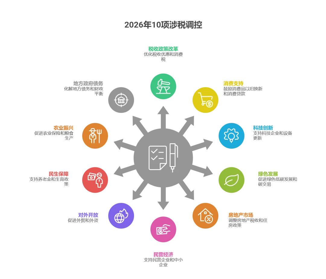 今天为大家梳理了2026年《政府工作报告》中关于税收工作的10项要点。新的一年,税收不仅是国家口袋里的“钱袋子”,更是调控经济、惠及民生、推动创新的重要杠杆。以下是2026年政府将着重推进的十大税收工作任务: