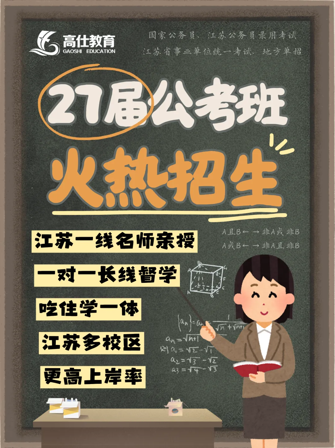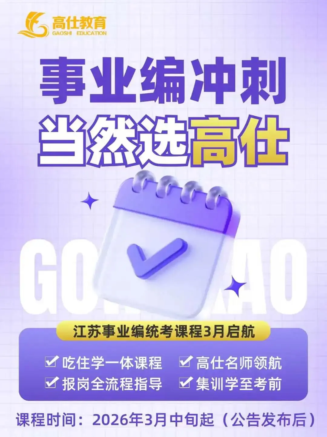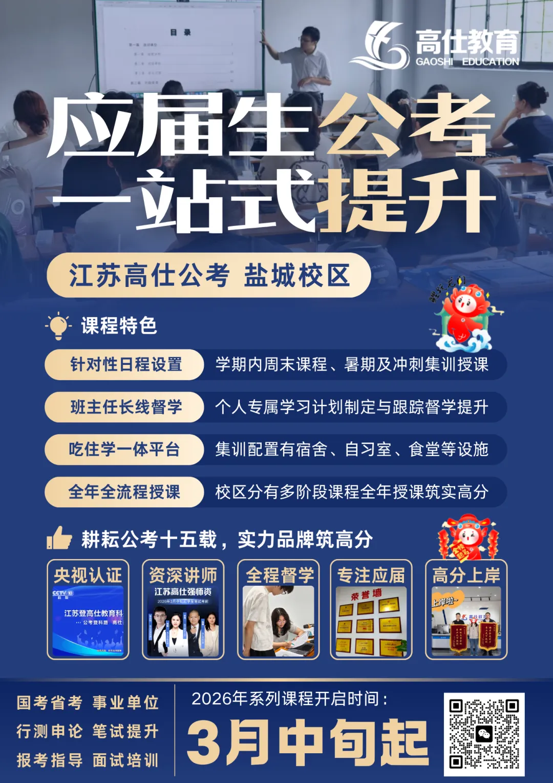 为满足在校大学生及在职逐梦人的备考需求,江苏高仕公考针对性设置课表,以平日周末课程+暑期集训+考前冲刺集训的授课形式,从导学课、基础理论,再到强化提升、刷题拔高,最后在考前进行冲刺与押题模考。全年式授课教学。